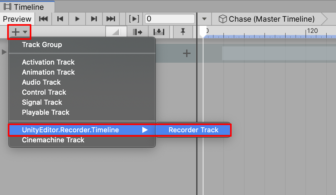 1. With the Master Timeline selected in the Hierarchy, we’ll use the Recorder Track to control the output of our project. To add a Recorder track, click the + sign in the Timeline window and select: UnityEditor.Recorder.Timeline > Recorder Track (Figure 02).