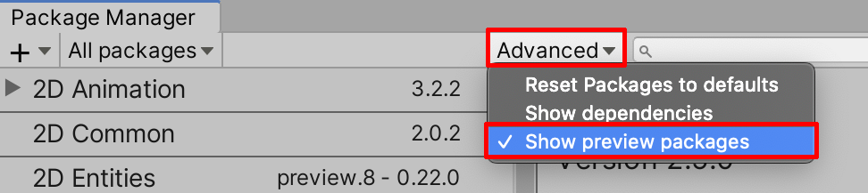 2. In the Package Manager window, select Advanced > Show Preview Packages (Figure 01).