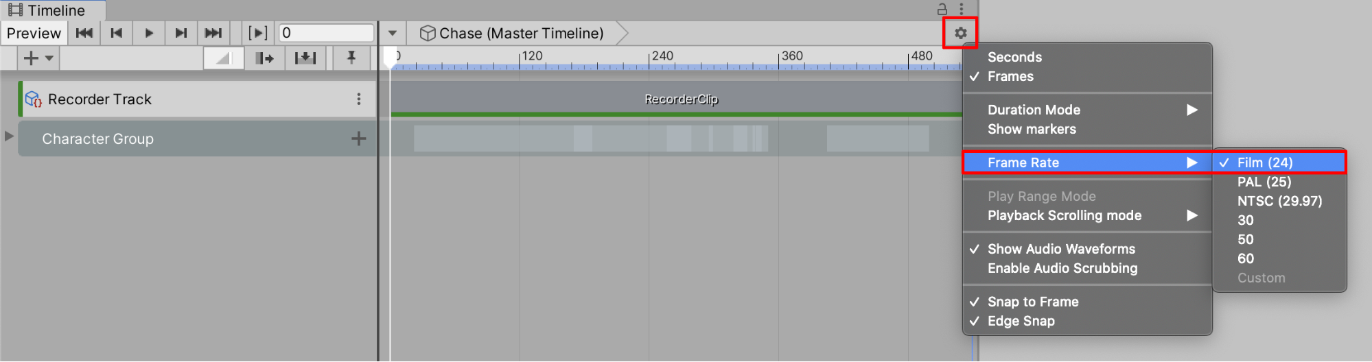 4. We will render our final animation as a .mp4 file. When rendering a movie file as a .mp4, the Recorder Clip will match the frame rate designated in the Timeline. To change the frame rate, select the Options gear icon to the right of the Timeline window, then select Frame Rate. Select from the designated frame-rate options. We will keep our project’s frame rate consistent to a film animation of 24 frames per second (Figure 07).