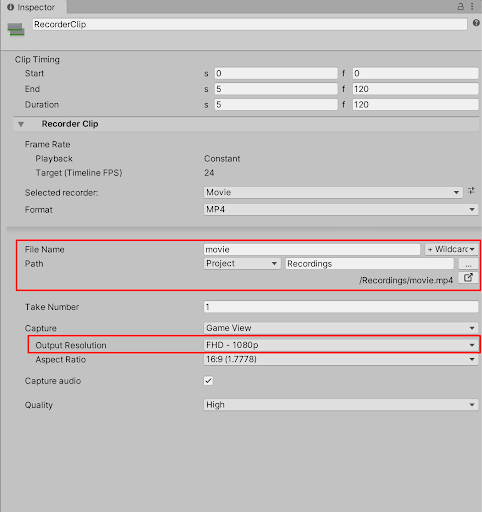 5. Specify a file name for your rendered movie. Ensure the Path drop-down menu is set to Project. A folder already exists in your project, named “Recordings.” Make sure the Path is already set to the Recordings folder by selecting the button with the three small dots and then selecting the Recordings folder in your project. Set the Output Resolution to either HD - 720p for a lower resolution video, or FHD - 1080p or even 4K for a higher resolution. Look over your Recorder Clip’s settings to make sure they match the following specifications (Figure 08).