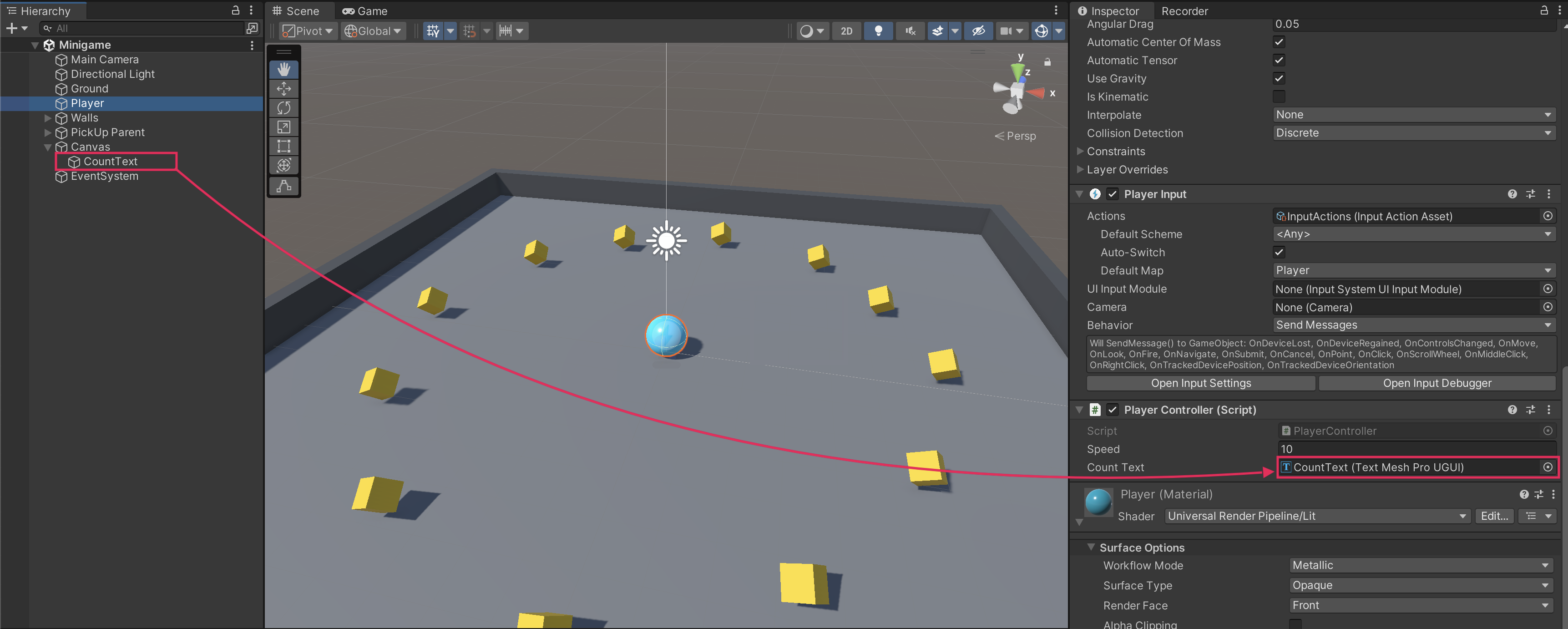 - Select the Player GameObject in the Hierarchy window, then drag the CountText GameObject into the Count Text slot to reference the UI text element.