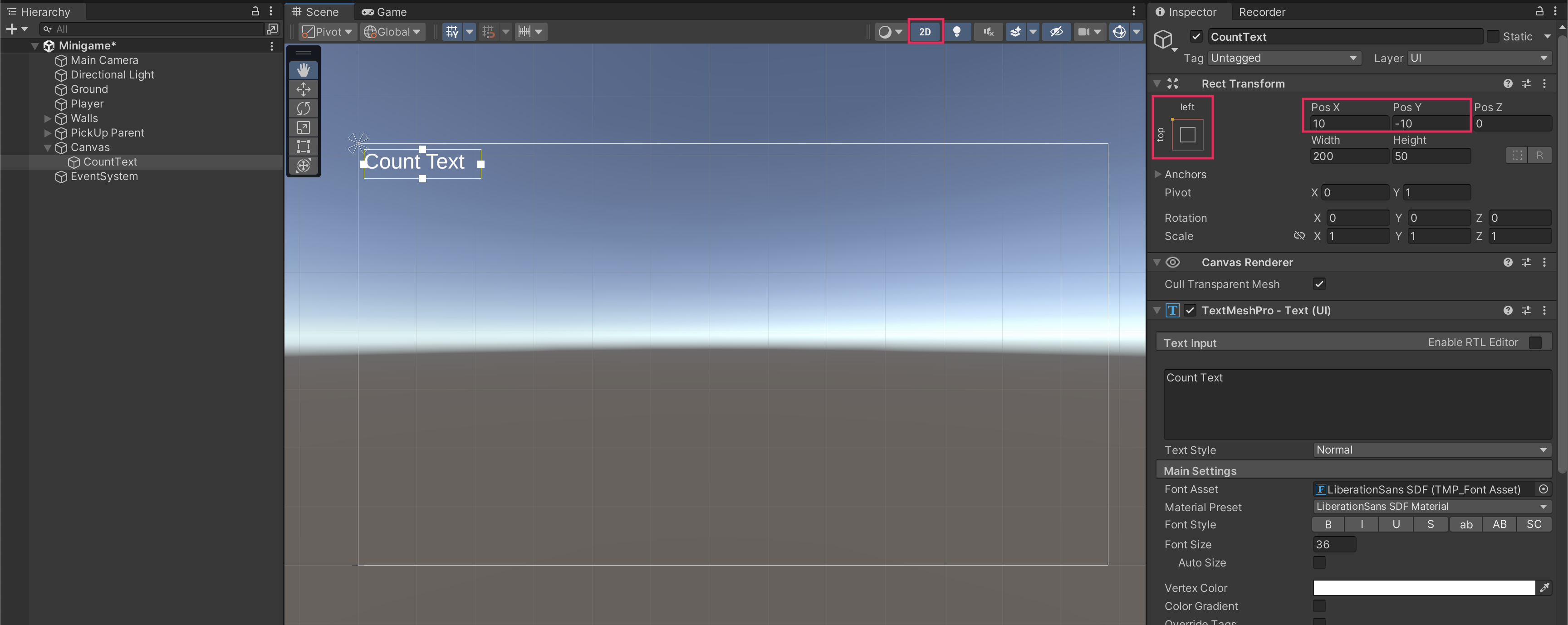Follow the video or text instructions below to add a Text GameObject named “CountText”, preview the full canvas in 2D view, edit the text, and edit the text position: