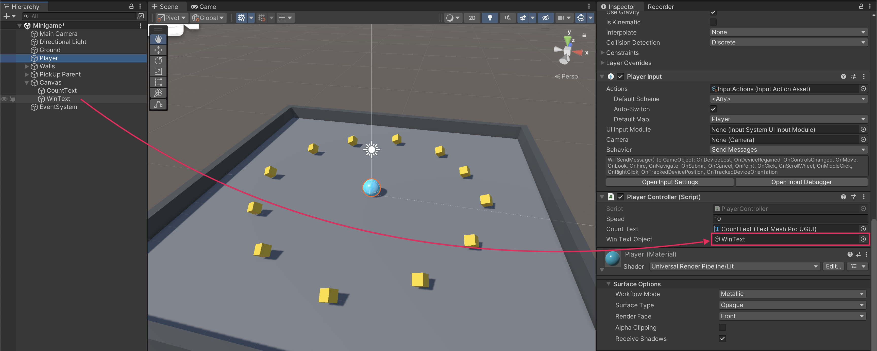 - Select the Player GameObject in the Hierarchy window, then drag the WinText GameObject from the Hierarchy window into the Win Text Object variable slot.