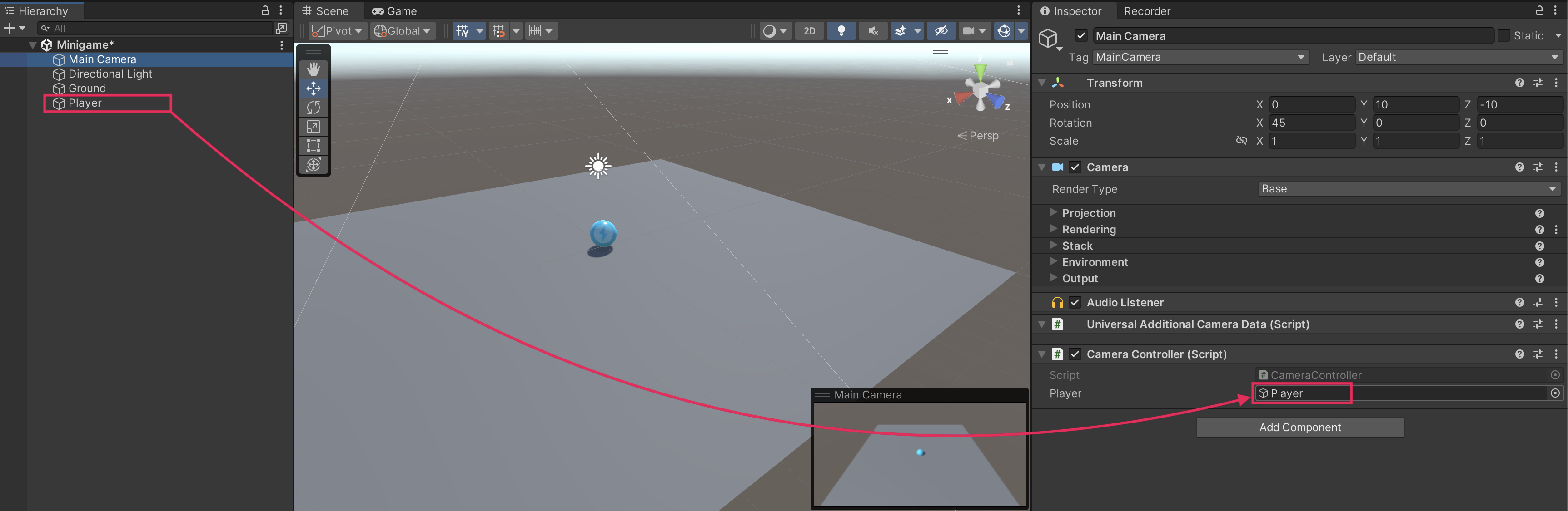 - Drag the Player GameObject from the Hierarchy window into the Player slot in the CameraController component.