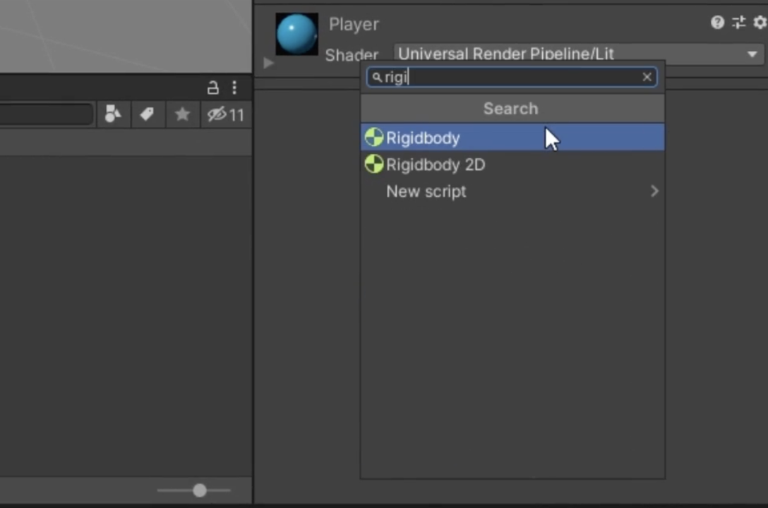 - In the Inspector Window, select Add Component, then search for "Rigidbody" and add the Rigidbody component to the Player GameObject.