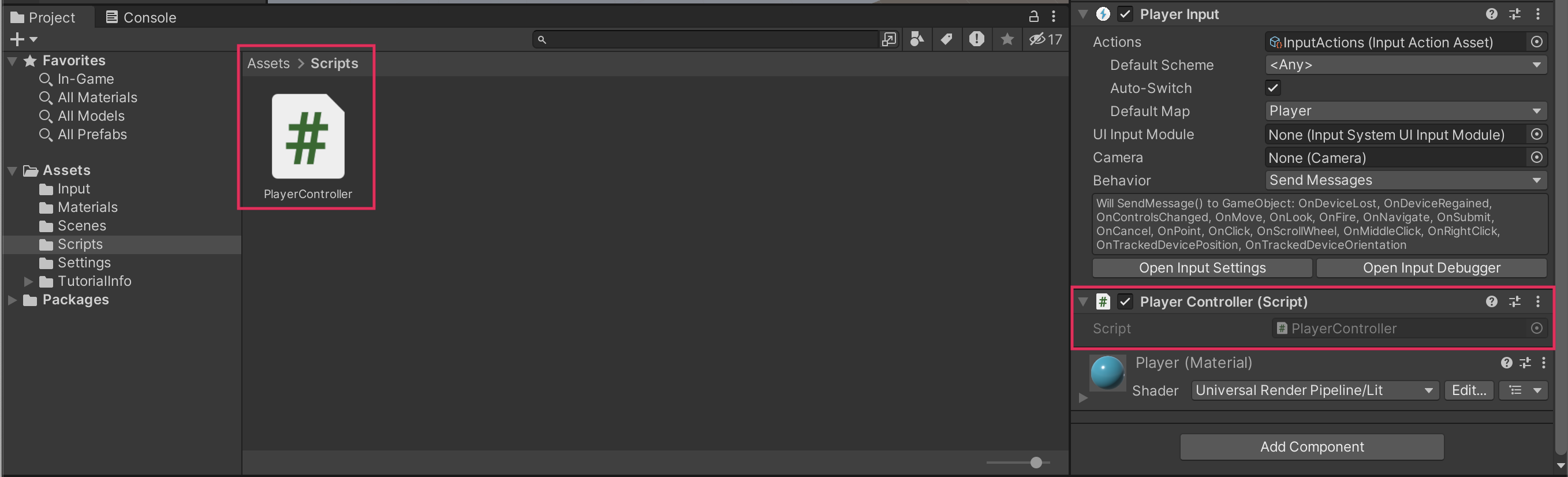 - The created script asset will be at the root level of the Assets folder by default. Move the new PlayerController script asset into the Scripts folder.