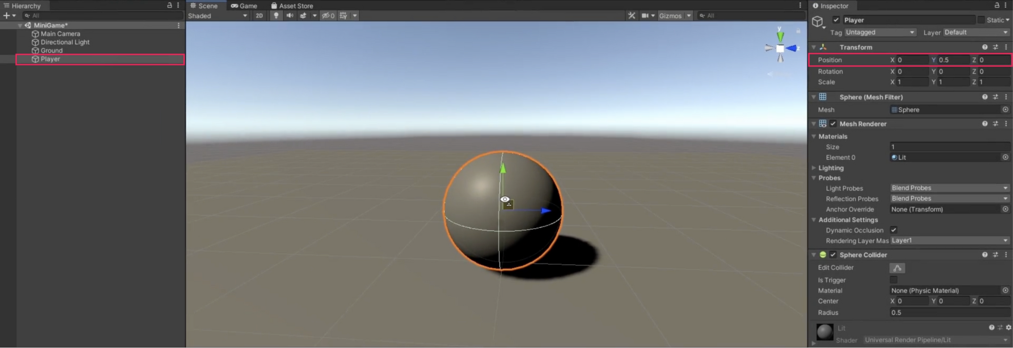 - Rename the newly created Sphere GameObject "Player".