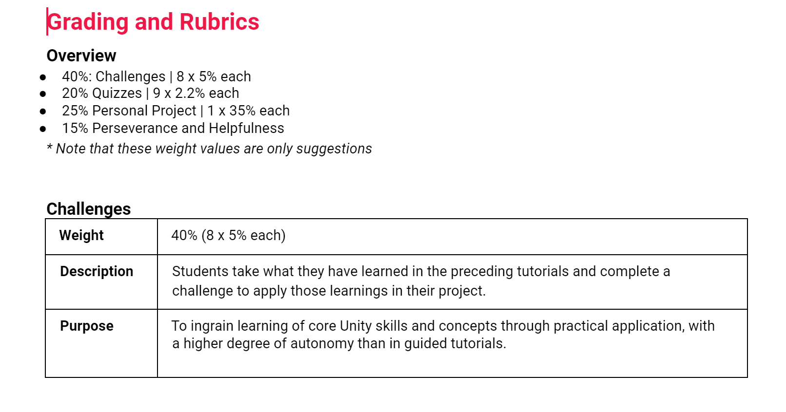 - How do you plan to track and assess student work? Will you use version control? What rubrics or other grading tools and philosophies will you employ?