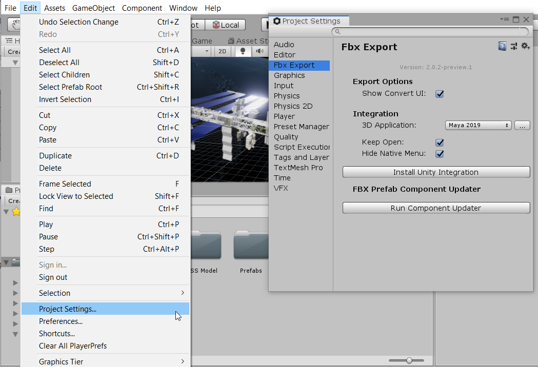 - If the FBX Exporter does not appear and is still in “Preview,” click "Advanced > Show Preview Packages.” At the time of this tutorial’s creation, the FBX Exporter is still in “Preview.”