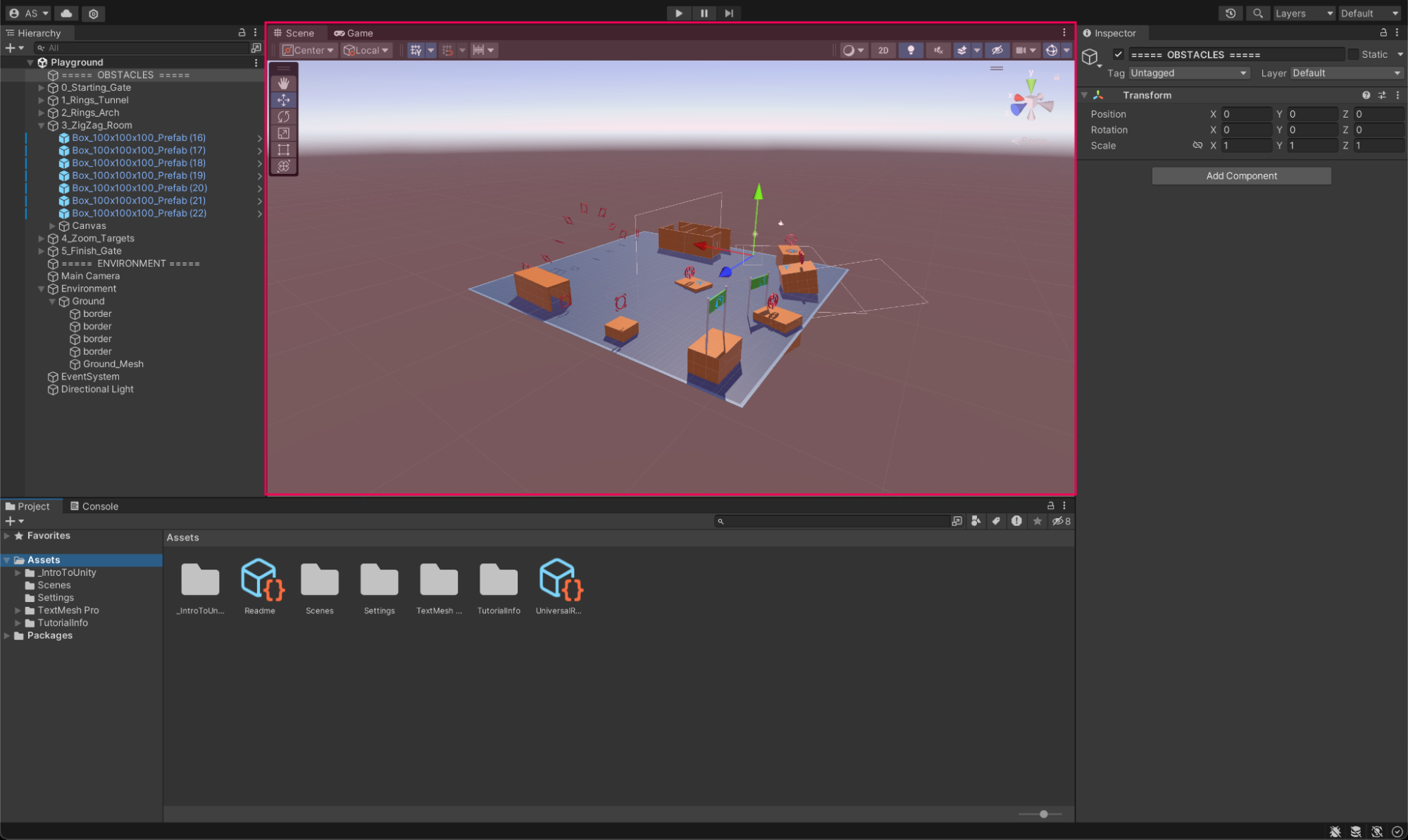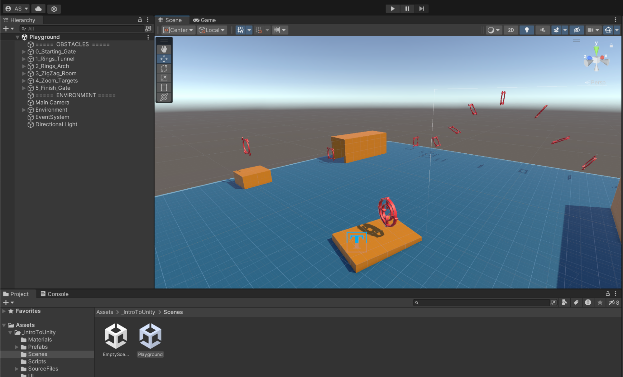 Your goal in this step is to get comfortable enough navigating 3D space in the Scene view so that you can successfully navigate the obstacle course set up in this playground using a variety of 3D navigation techniques. Here is a video preview of what you’ll try to do in this step: