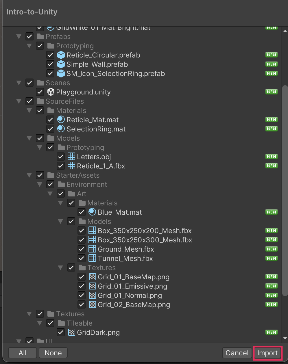 - A new window will open with a list of assets. Select Import to bring them into your project.