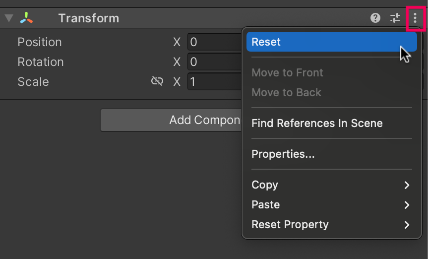 Note: To reset the Transform coordinates, you can also select the More (⋮) menu in the top-right corner of the Transform component, then select Reset