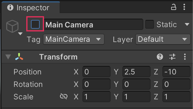 - In the Inspector window, next to the object’s name, disable the box at the top to mark the Main Camera as inactive.