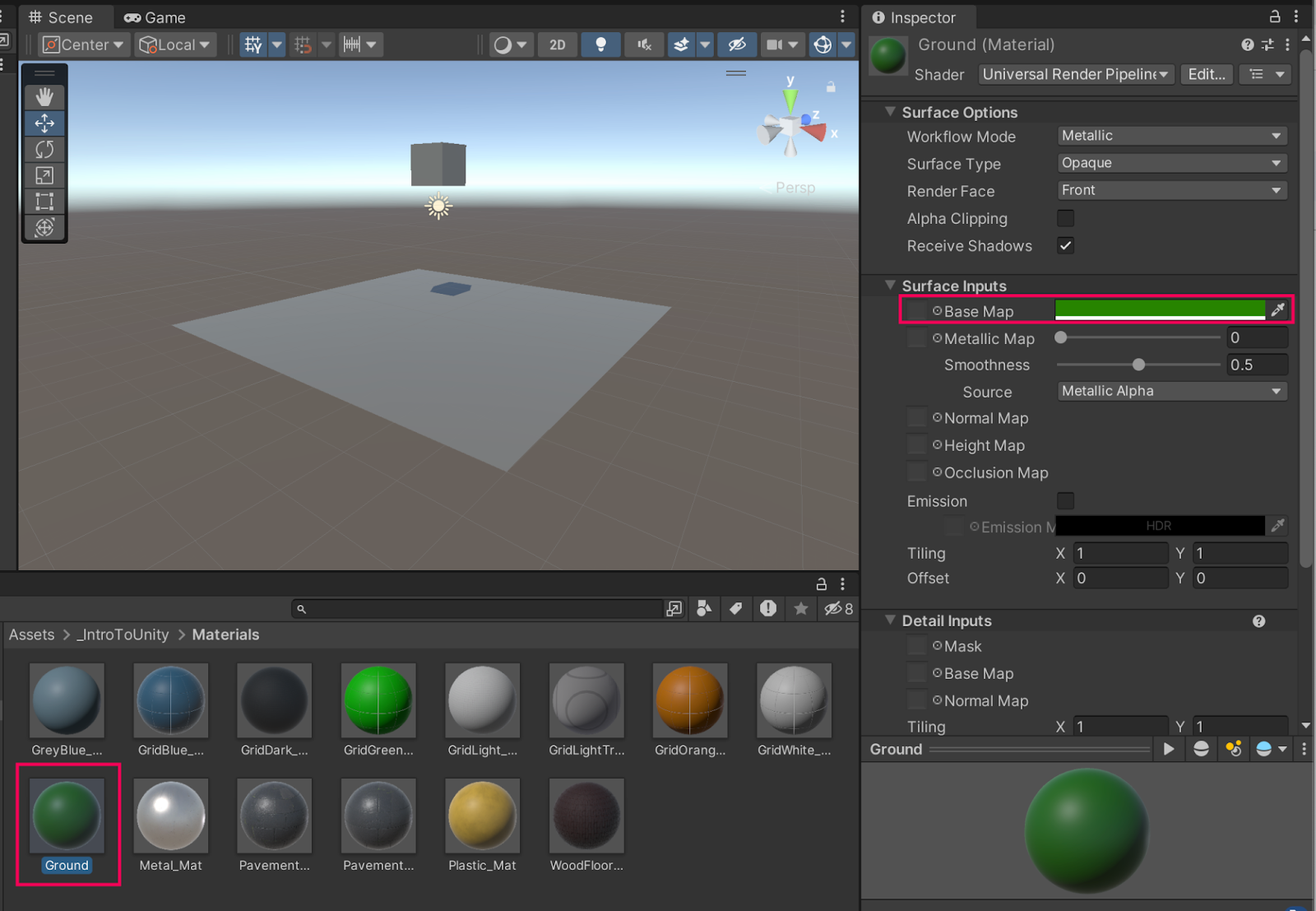 - After creating the material, in the Inspector window, select the color box next to Base Map property and select a color for your ground.