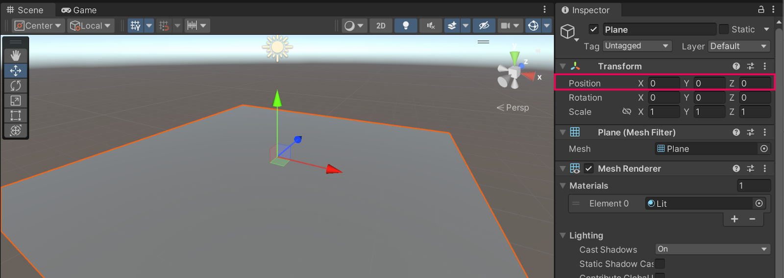To position the plane accurately, you need to set its position to the center of the scene, otherwise known as the origin. The origin is the point where the X, Y, and Z axes intersect (0, 0, 0).