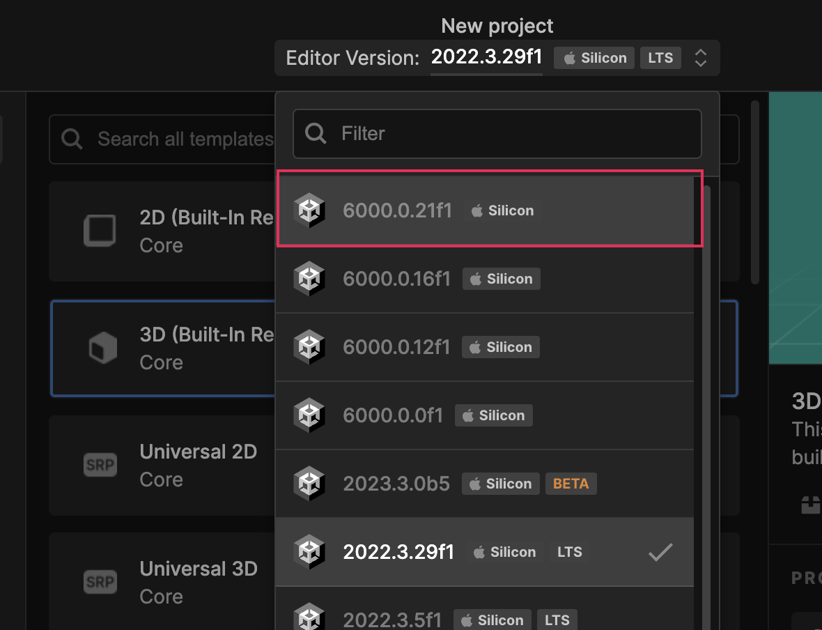 - From the Unity Hub, you can select which version of the Unity Editor you want to create your project with. This is especially useful if you have multiple versions installed.