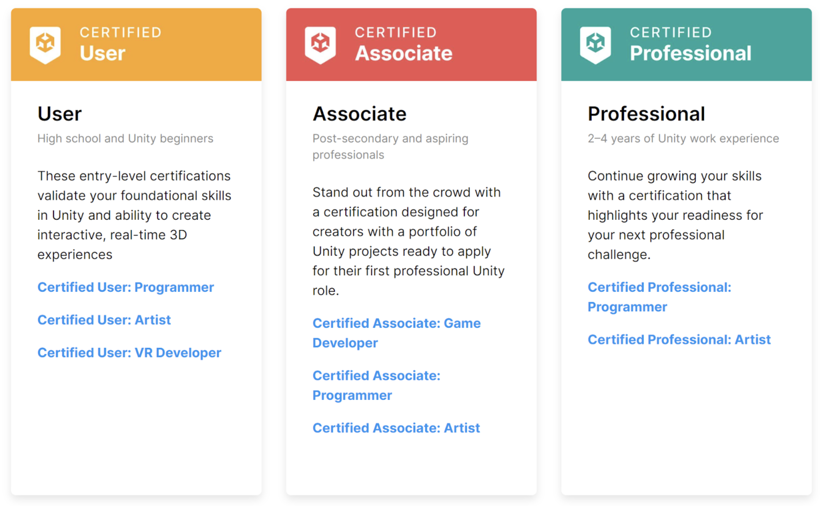 At Unity, we have a suite of certifications that are aligned to the real-time industry. These certifications are designed to validate your skills and knowledge in using Unity to help you stand out in the job market.
