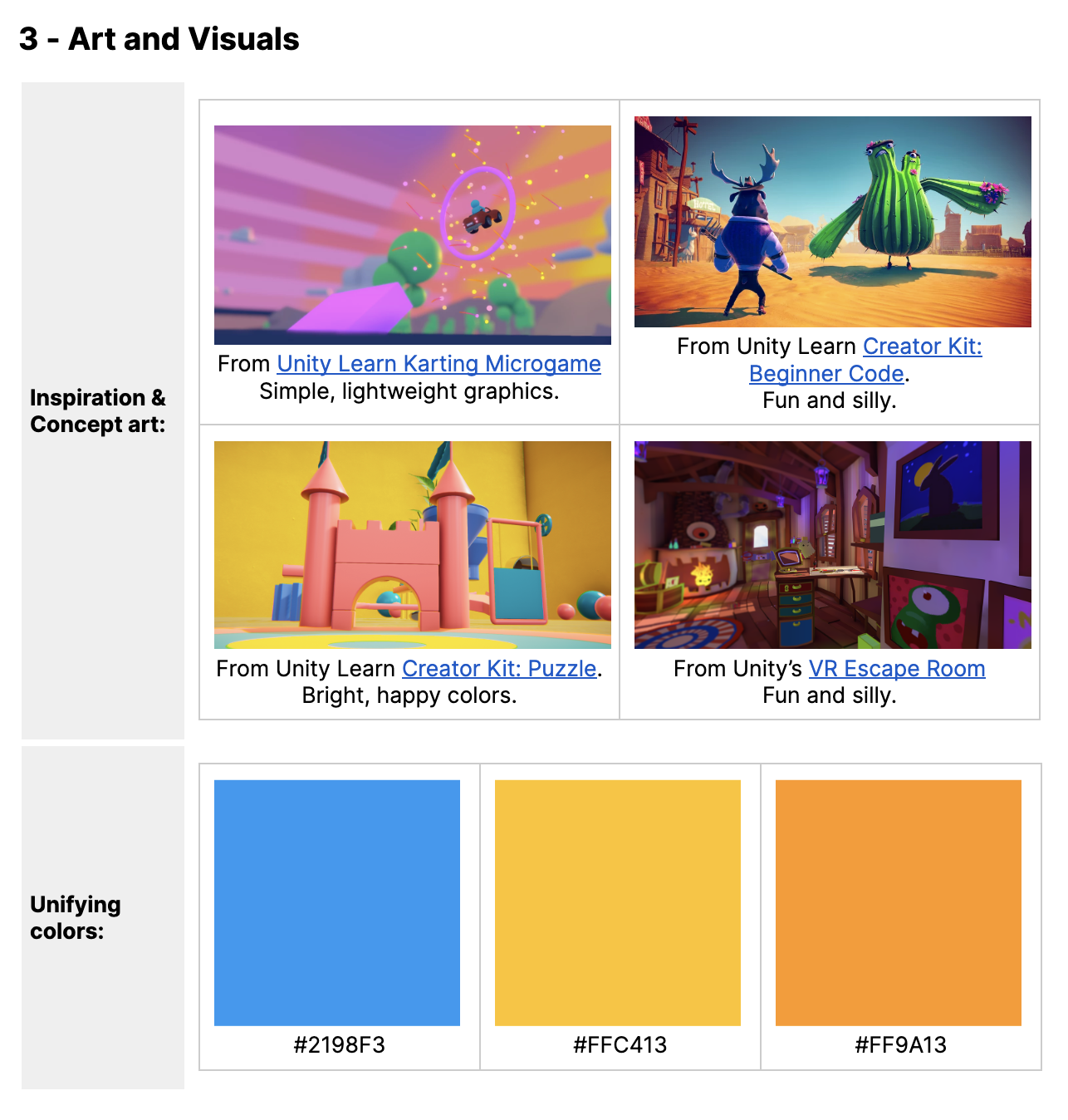 By the time you are done with this step, the Art and Visuals section of your GDD should look something like the image below, but with your own unique concept.