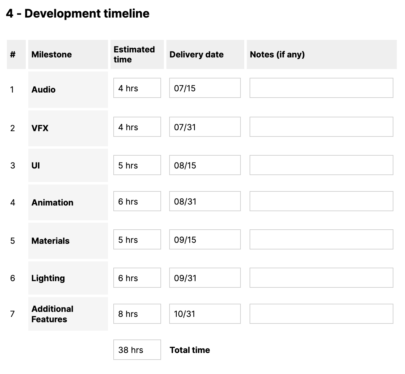 By the time you are done with this step, the Development Timeline section of your GDD should look something like the image below, but with your own unique timeline. You likely won’t have any notes at this point, so you can leave that section blank for now.