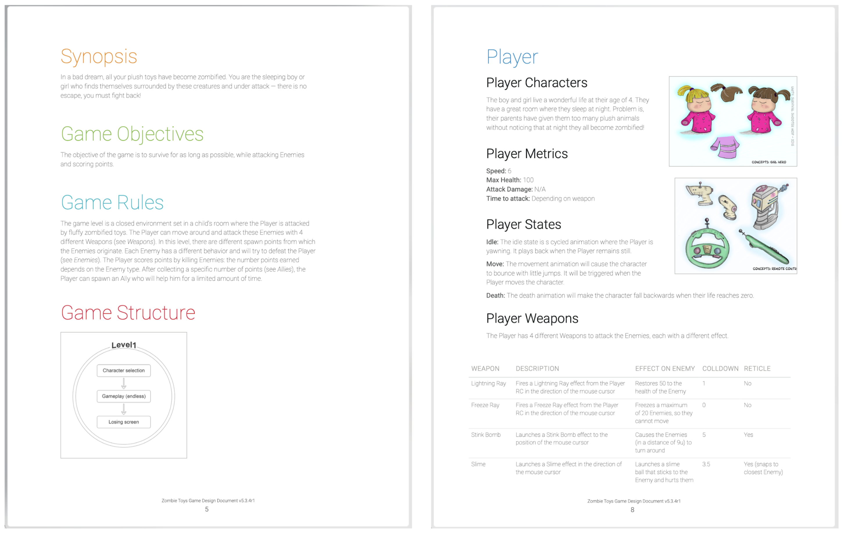 Below are a couple of pages of a GDD from a simple example Zombie Toys game. You can also download the full example document if you like.