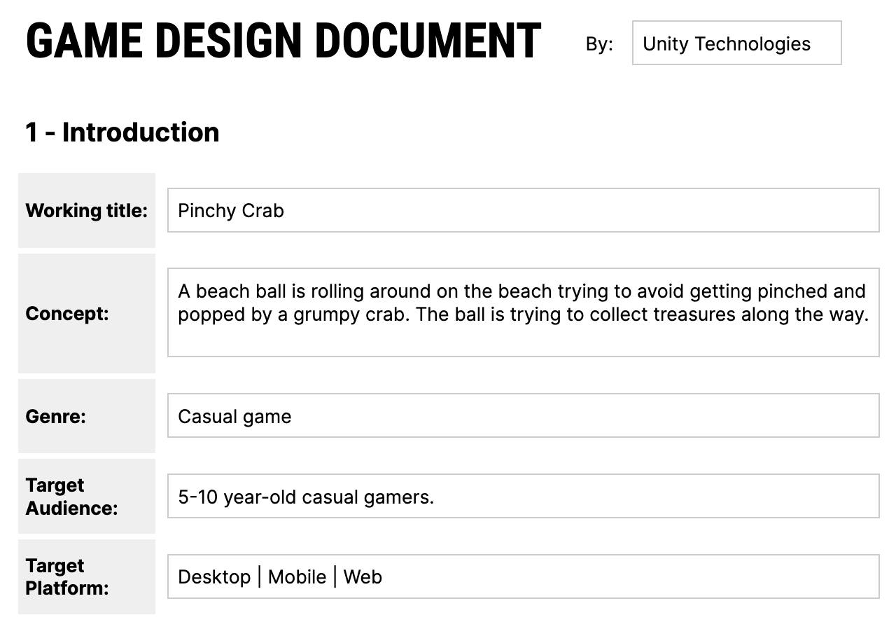 By the time you are done with this step, the Introduction section of your GDD should look something like the image below, but with your own unique concept.