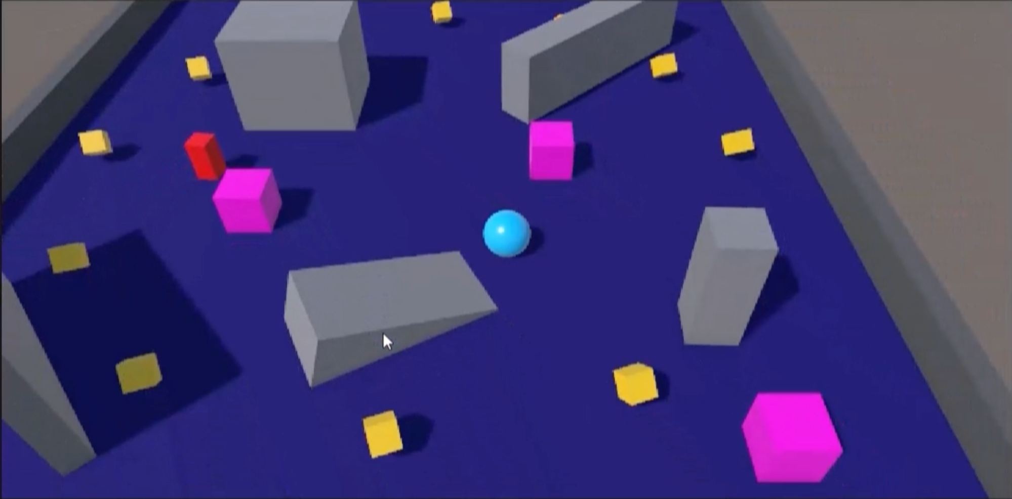 Your game is currently a relatively simple setup where a sphere rolls around to collect rotating cubes while evading a rectangular enemy. It is quite fun to play, but lacks a distinguishing element like a storyline, theme, art style, or unique gameplay mechanics.