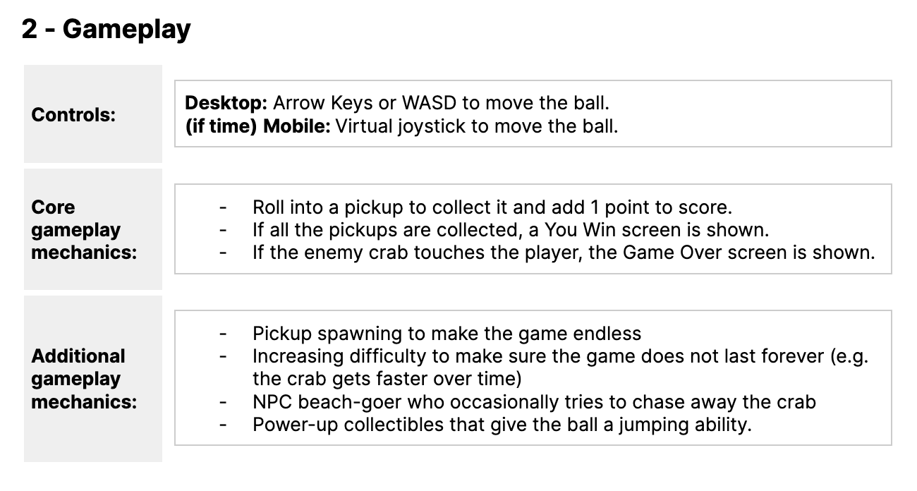 This is your opportunity to describe any special features or mechanics that could really distinguish your game from others. For instance, you might decide to introduce a non-player character (NPC) to add more depth to your game. In the crab and beach ball example, there could be a human laying on the beach who occasionally distracts or chases away the crab.