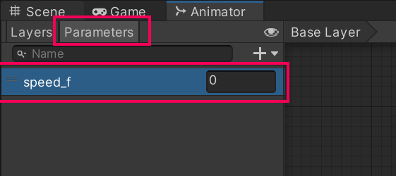 8. In the Animator window, switch to the Parameters tab and add a new float parameter. Name it “speed_f”.