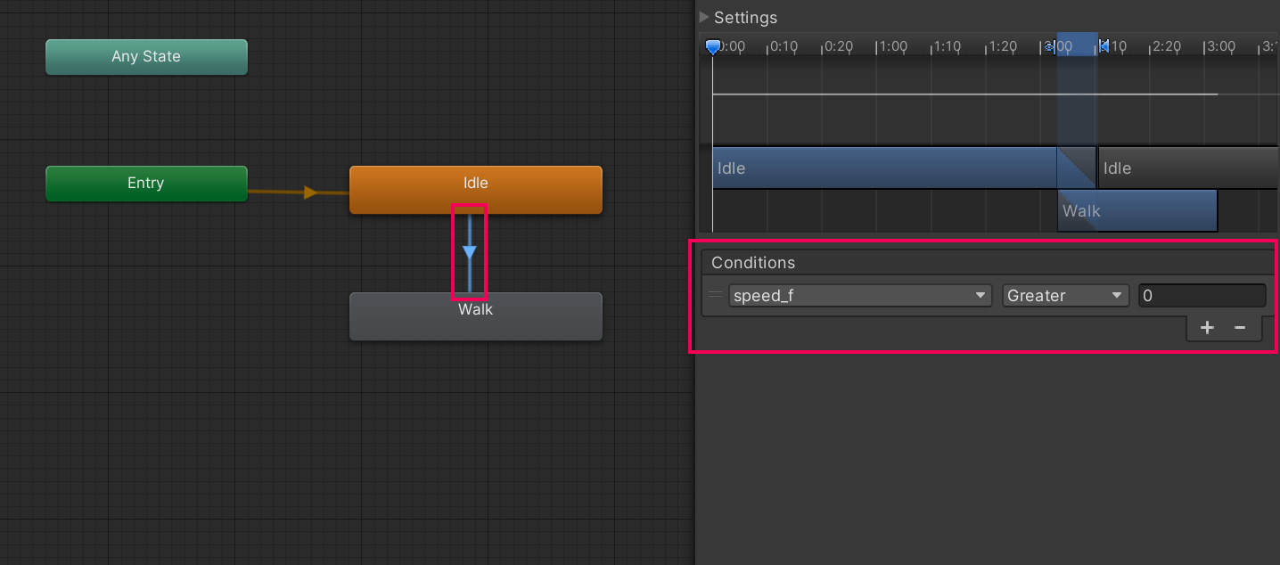 9. Select the transition line between the Idle and Walk animations and in the Inspector window, select the Add (+) button under Conditions to add a new condition.