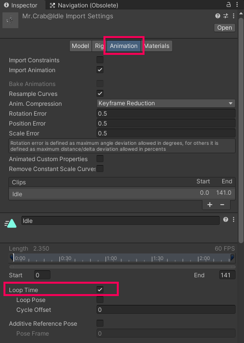 5. In the Project window, select the animation clip again. In the Inspector window, select the Animation tab, and then enable Loop time.