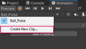 1. With the ball selected in the Hierarchy, use the top left menu under playback controls that lists Ball_Pulse as the current animation, and select Create New Clip.