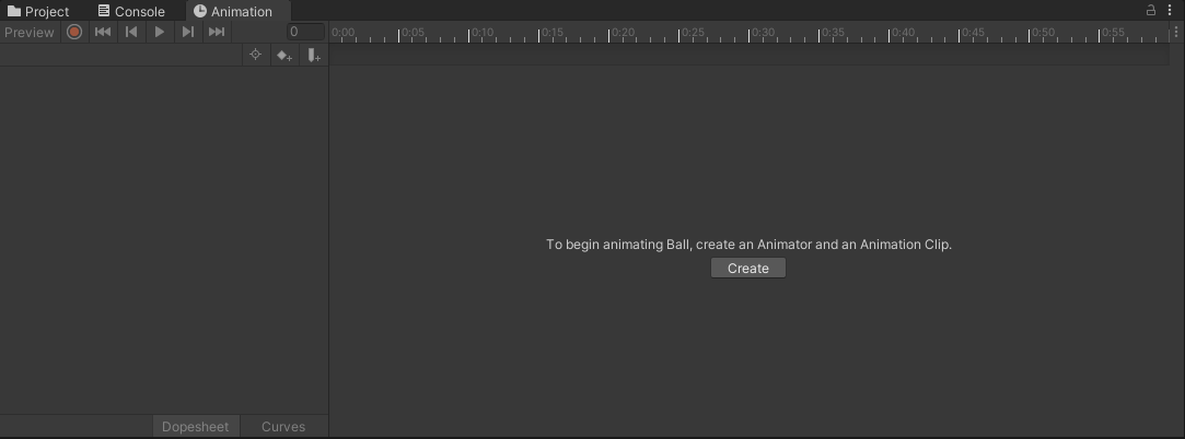 In the Animation Editor, notice that a Create button has appeared in the main work area. This button will always appear for any selected object that doesn’t yet have any animation associated with it. If you select an object that has already been animated, the first animation created will be shown in the Animation Editor instead.