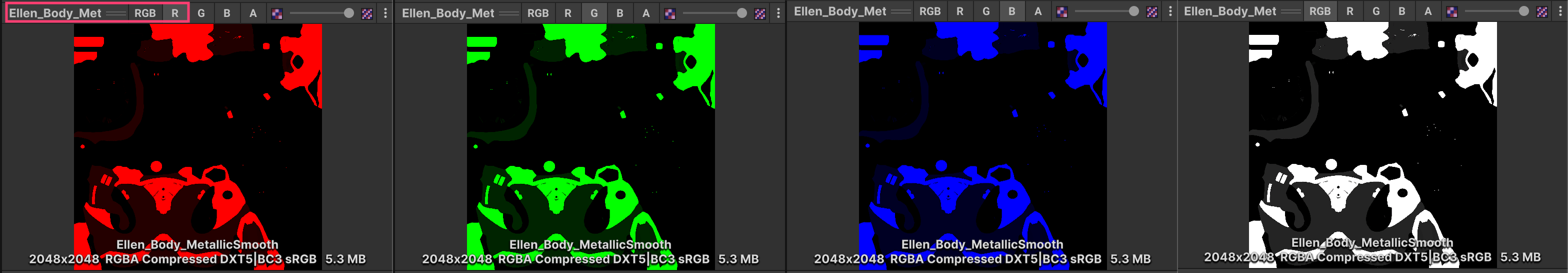 Since Ellen’s body material uses the Metallic workflow, this map is grayscale. If you select the Ellen_Body_MetallicSmooth texture in the Project window you can see the metallic data is stored in the R, G, and B channels of the texture file.However, the shader only reads the R channel.smoothness across the many different types of surface on Ellen’s body model.