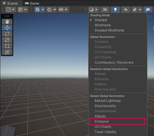 2. In the Scene view control bar, use the Draw Mode dropdown to select Emissive.