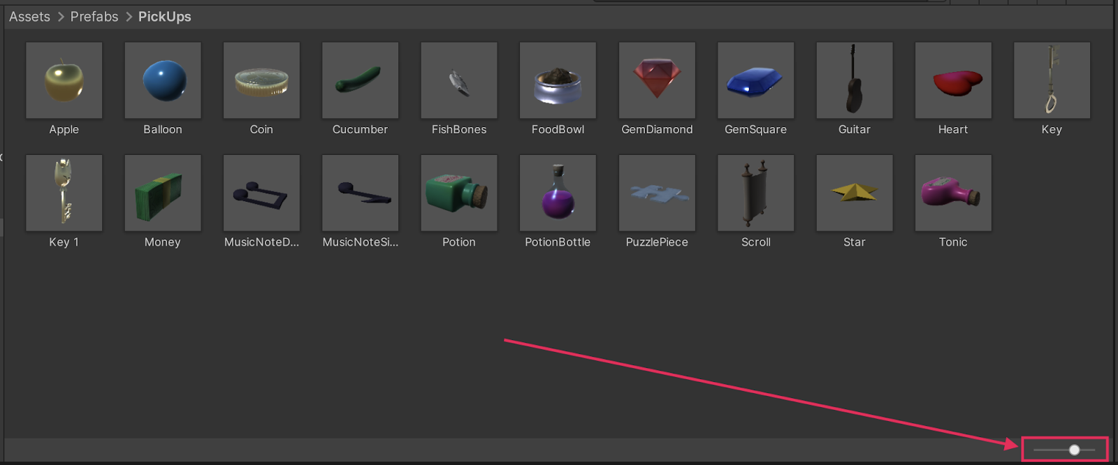 The Icon size slider at the bottom right of the Project window allows you to adjust the size of your asset icons. Larger icons are helpful for quickly previewing models or materials, while the list view is more beneficial for scanning, sorting, and organizing assets.