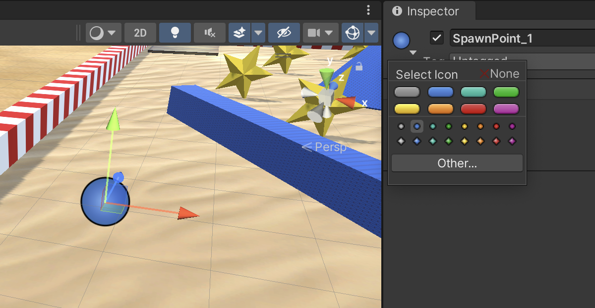 Icons can be assigned to GameObjects in the Inspector window. This feature is particularly useful for empty GameObjects that you want to visualize in the Scene view but that would otherwise be invisible, like a spawn point.