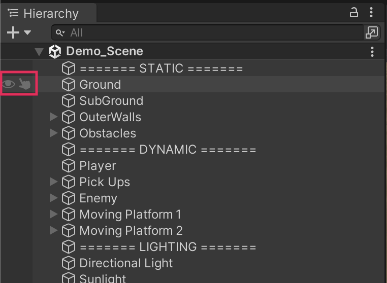 The pickability toggle (hand icon) allows you to enable or disable the selection of a GameObject in the Scene view. When pickability is disabled (hand icon crossed out), you won't be able to select the GameObject by selecting it in the Scene view. This is helpful for preventing accidental selection and modification of certain GameObjects while working on a scene. You might consider making your ground GameObject not pickable, for example.