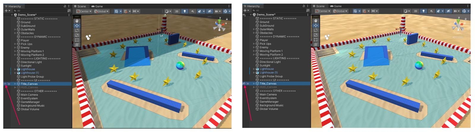 The scene visibility toggle (eye icon) allows you to quickly show or hide a GameObject in the Scene view without affecting its active state in the actual game. This is useful for decluttering the Scene view during development and editing. For example, you might want to toggle your UI canvas as invisible — look at the difference in the image below.