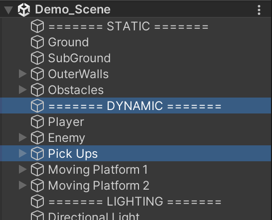 Empty GameObjects can serve as useful organizational tools in the Hierarchy window. By creating empty GameObjects, you can effectively divide the list of GameObjects, thereby making the Hierarchy window easier to navigate. Additionally, using empty parent GameObjects allows you to expand or collapse lists of GameObjects, adding another layer of organization to your Hierarchy window. You can see examples of both of these techniques in the screenshot below.