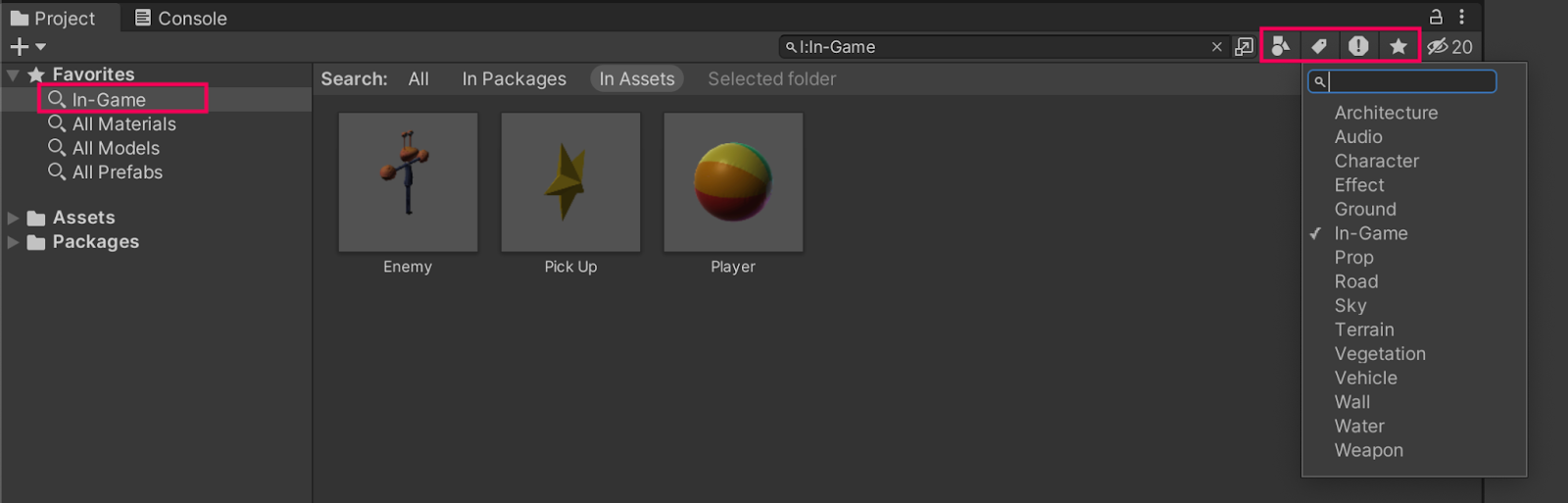 Similar to the Hierarchy window, you can search multiple ways in the Project window. You can search by name, of course, but you can also use the toolbar to search for asset type or even custom labels in the Project window. This feature allows you to filter your assets based on specific criteria, making it easier to locate what you need. You can also then save and reference those favorite searches in the Favorites dropdown.