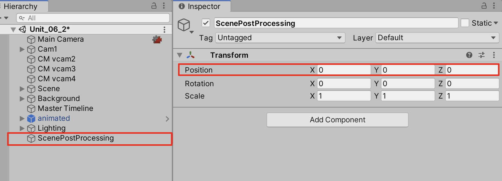 4. We’ll now add Post Processing settings to the Scene using the Volume framework system. From the top menu drop-down, select GameObject > Create Empty, rename it ScenePostProcessing, and set the Position’s X, Y, and Z values to 0 (Figure 03).