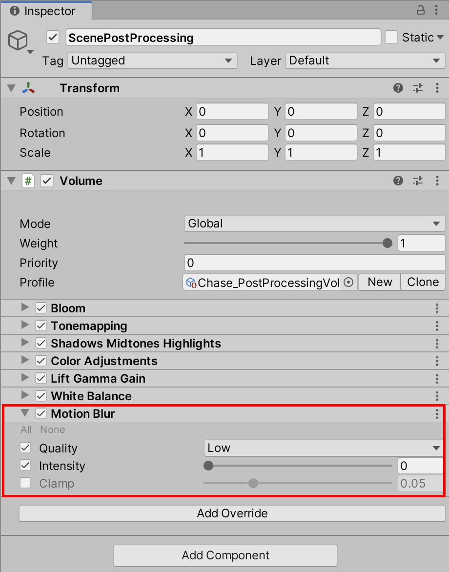 11. With the ScenePostProcessing GameObject selected in the Hierarchy, select Add Override and then select Post-processing > Motion Blur. Enable the checkboxes for Quality and Intensity (Figure 19).