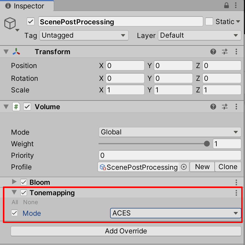 1. With the ScenePostProcessing GameObject still locked in the Inspector, select Add Override and then select Post-processing > Tonemapping. Check the Mode checkbox, then in the Mode field, select ACES (Figure 09).