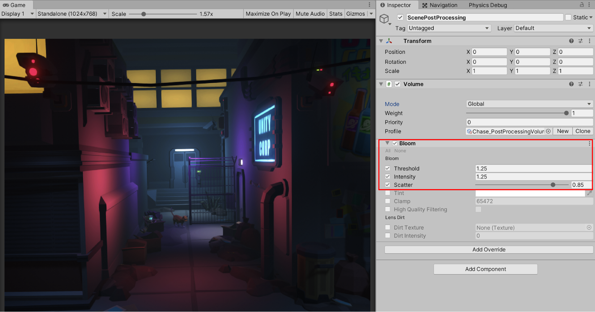 Bloom makes lights expand into surrounding objects. In order to apply the Bloom effect, you’ll need to be looking at an area of the Scene with light sources turned on. It will be helpful to keep the Scene, Game, and Timeline windows visible. Zoom in to an area of your Scene, such as the alley, so you can preview how Bloom changes the lighting.