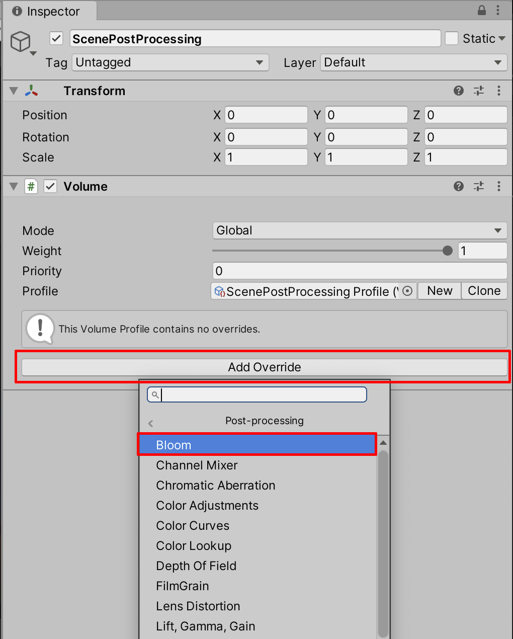 3. We’re now ready to add an override to the ScenePostProcessing Volume, which is still visible and locked to the Inspector window. Select Add Override and then select Post-processing > Bloom (Figure 07).