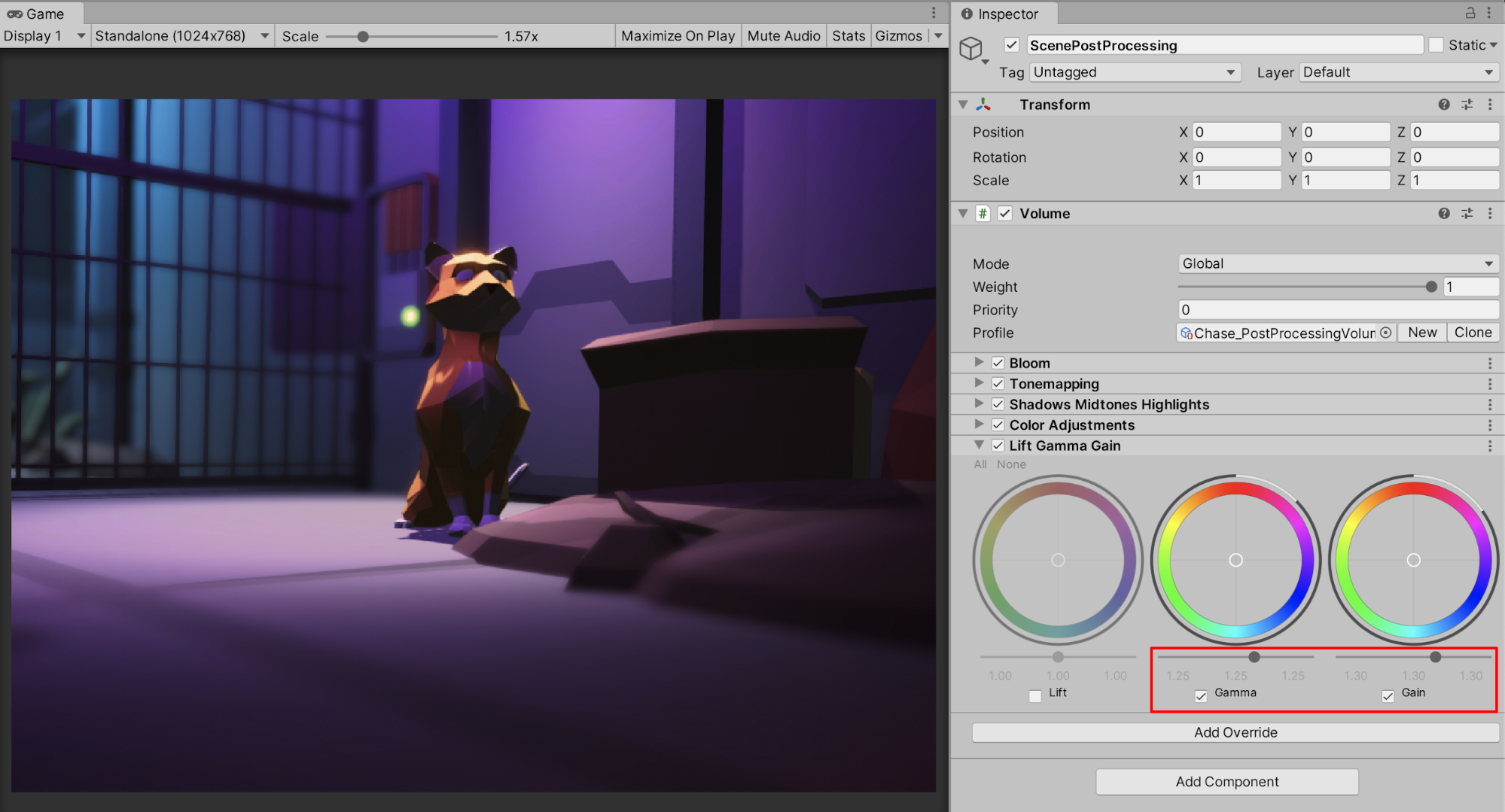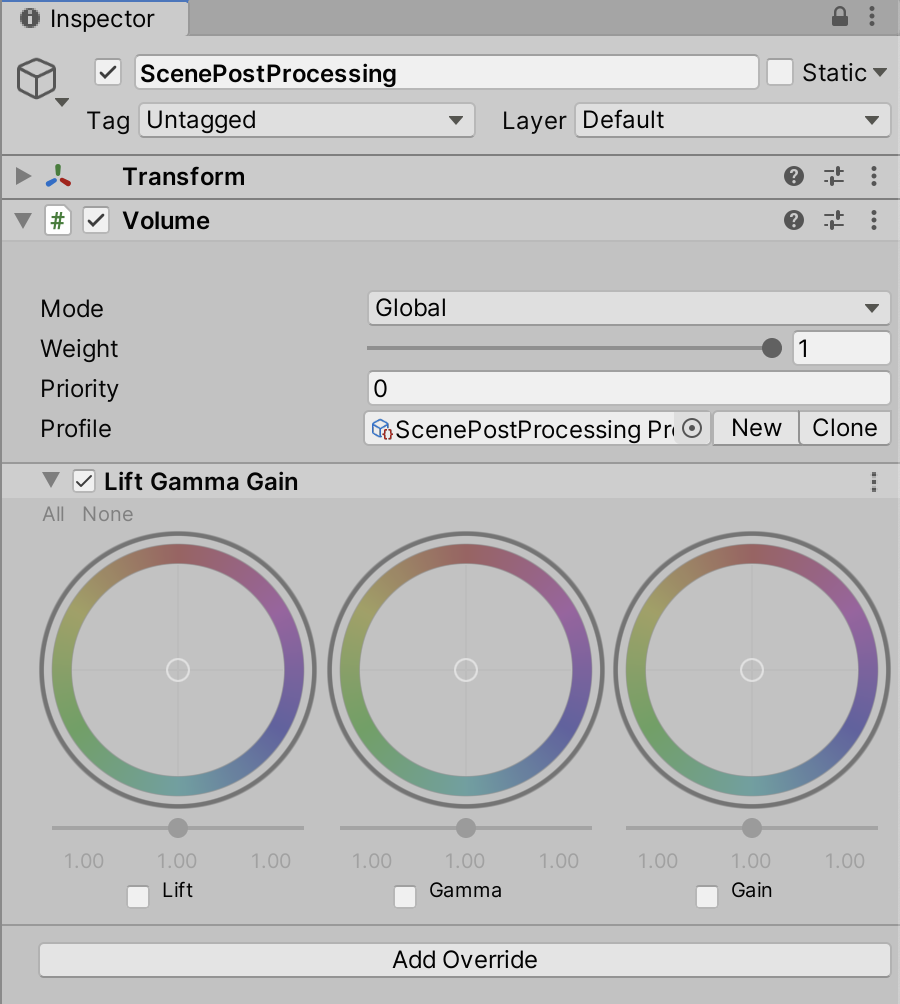 5. With the ScenePostProcessing GameObject still locked in the Inspector, select Add Override and then select Post-processing > Lift, Gamma, Gain (Figure 14).
