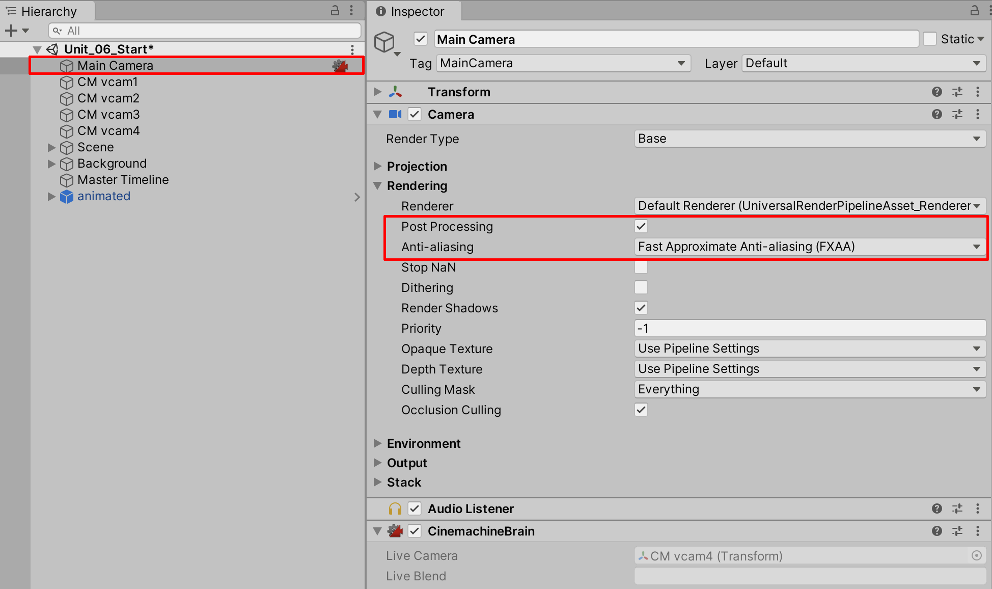 3. Select the Main Camera in the Hierarchy window to view its properties in the Inspector. Enable Post Processing in the Rendering settings by selecting the checkbox. Additionally, change the Anti-aliasing drop-down to Fast Approximate Anti-aliasing (FXAA) to improve graphical quality (Figure 02).