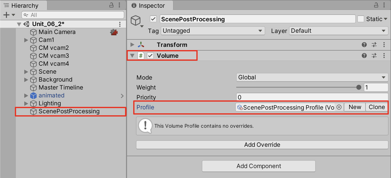 5. Select Add Component and search for and enable the Volume component. In the Profile settings, select New to create a new Profile (Figure 04).