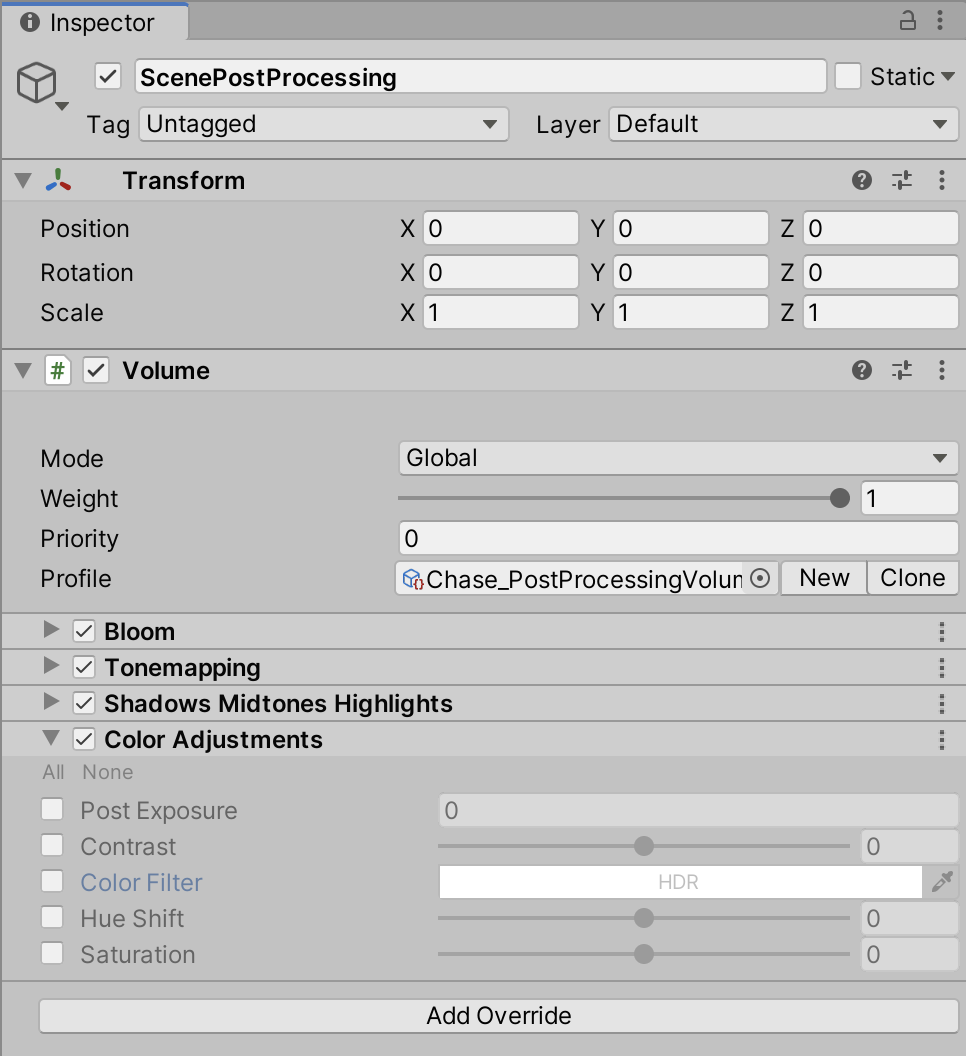 3. With the ScenePostProcessing GameObject still locked in the Inspector, select Add Override and then select Post-processing > Color Adjustments (Figure 12).
