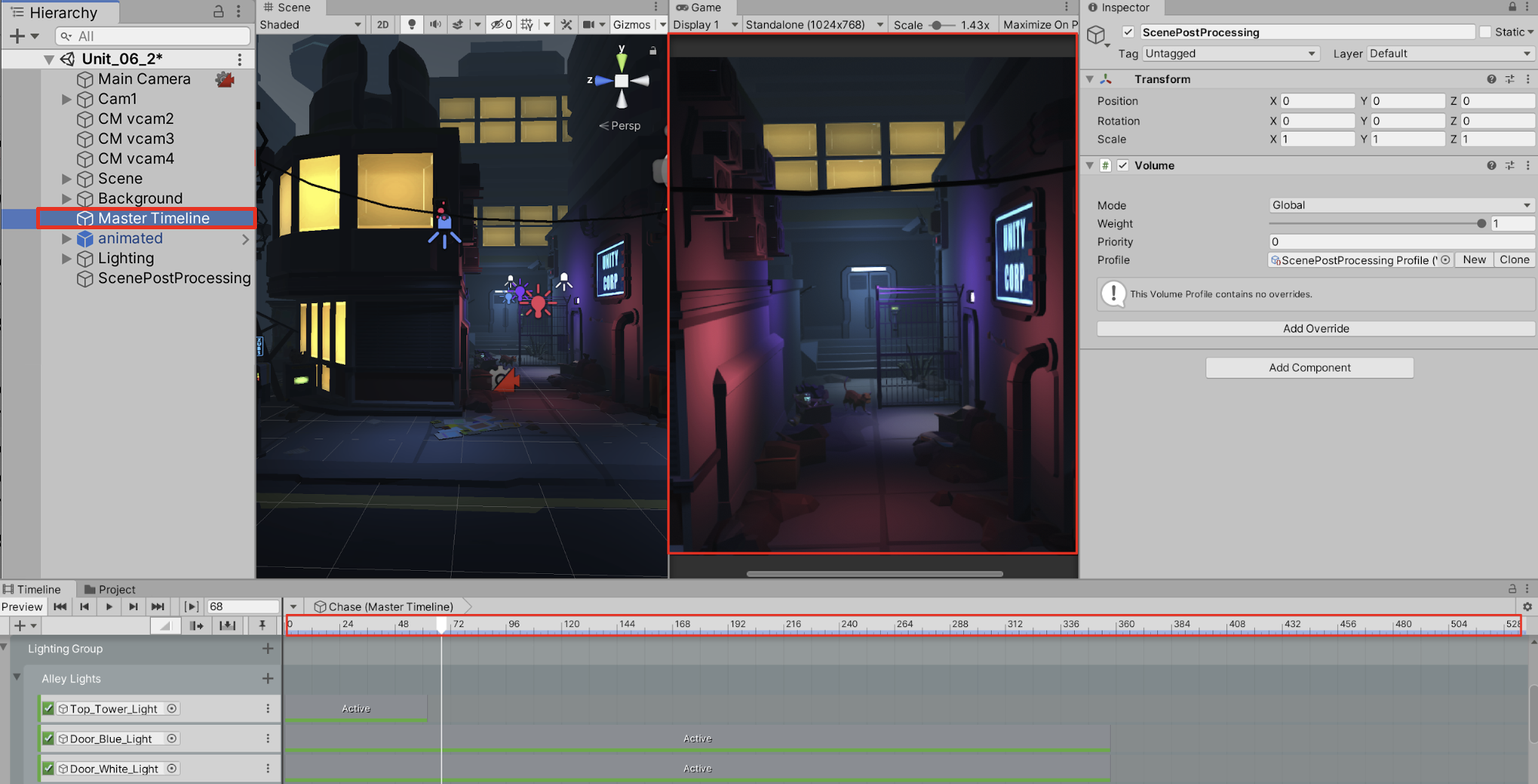 2. Next, select the Master Timeline in the Hierarchy window and position the frame playhead cursor along the Timeline to show the Game window’s camera view. Here, the frame playhead is set to Frame 68 to show the establishing shot in the Game window (Figure 06).